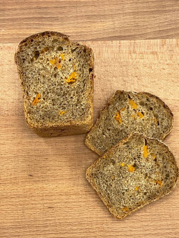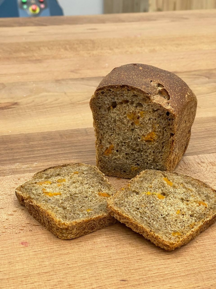 Пшеничный хлеб на органической муке приготовленный на закваске с ярко выраженным сочетанием кофейного вкуса в сочетании с курагой и ароматом ноток пряного красного апельсина.